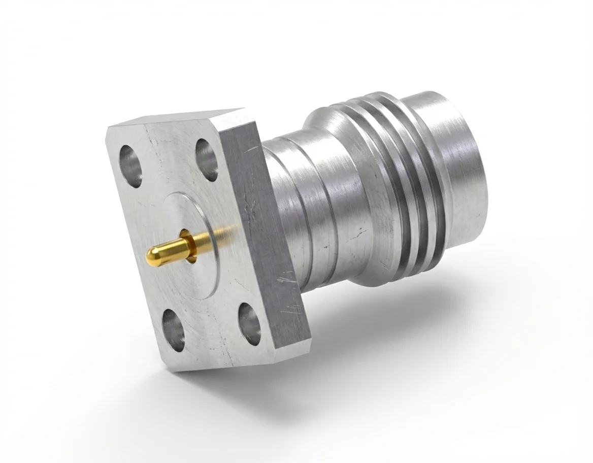 The 1.85-KFD4 4-hole flange mount RF connector is used in broadband calibration systems, modular analyzers, and high-frequency instrumentation requiring repeatable, low-loss interfaces. Mechanc offers customizable configurations including flange dimension changes, alternative plating finishes, and non-magnetic alloys to meet specific design requirements.