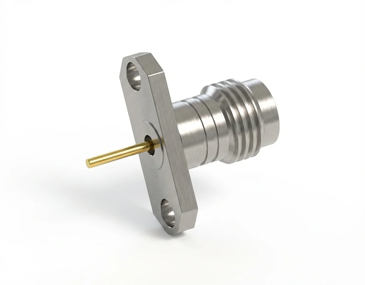 The 1.85mm female 2-hole flange mount RF connector with 12.22 mm hole spacing and an 0.8 mm pin diameter provides exceptional precision and durability for ultra-high-frequency test and measurement systems. Operating from DC to 67 GHz with 50 Ω impedance, the 1.85-KFD14 delivers industry-leading performance for demanding RF and microwave applications.