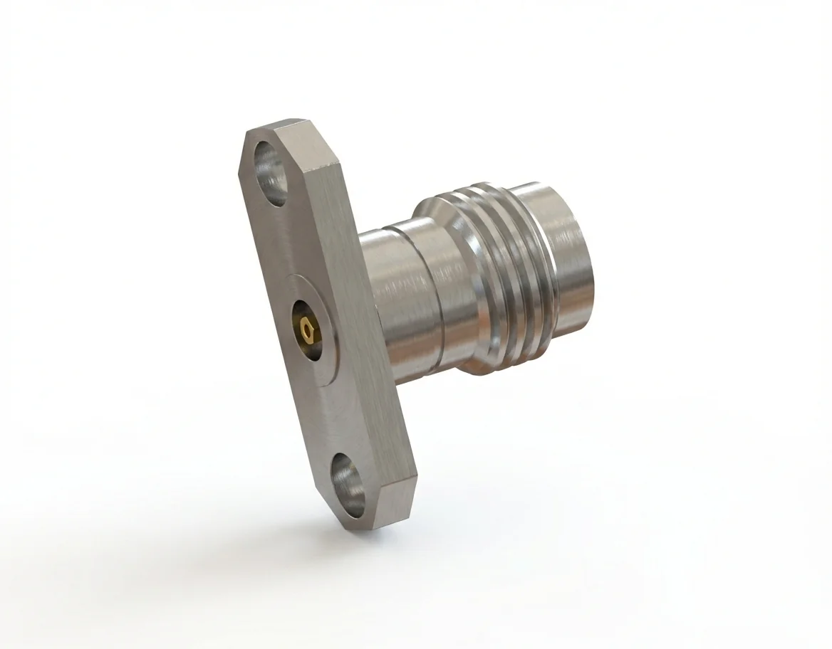 The 2.4mm female 2-hole flange mount RF connector delivers VSWR ≤ 1.2 and insertion loss ≤ 0.06 √F(GHz) dB, guaranteeing minimal return loss and consistent impedance control. The 0.46 mm pin enhances current-handling capacity, ensuring repeatable results under mechanical stress.