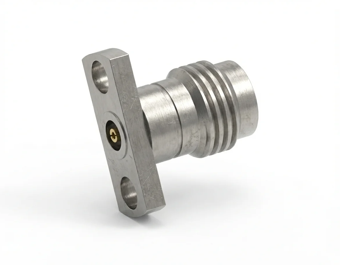 The 2.4mm female 2-hole flange mount RF connector achieves VSWR ≤ 1.2 and insertion loss ≤ 0.06 √F(GHz) dB, offering superior return-loss control and minimal signal degradation. The 0.51 mm pin diameter provides extended contact longevity and stable electrical transmission under load.
