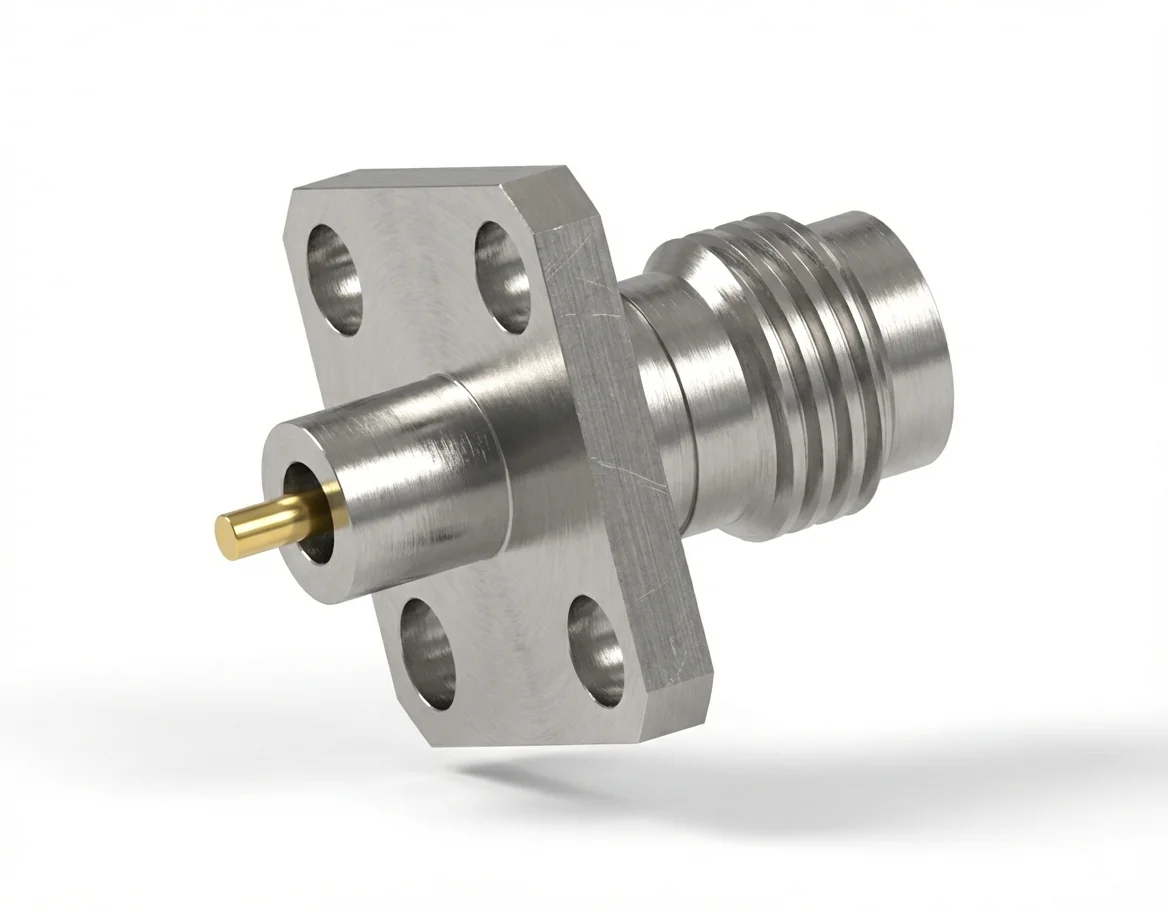 2.4mm Female 4-Hole Flange Mount RF Connector – Solder Attachment, 8.64mm Hole Spacing, 0.23mm Pin Diameter