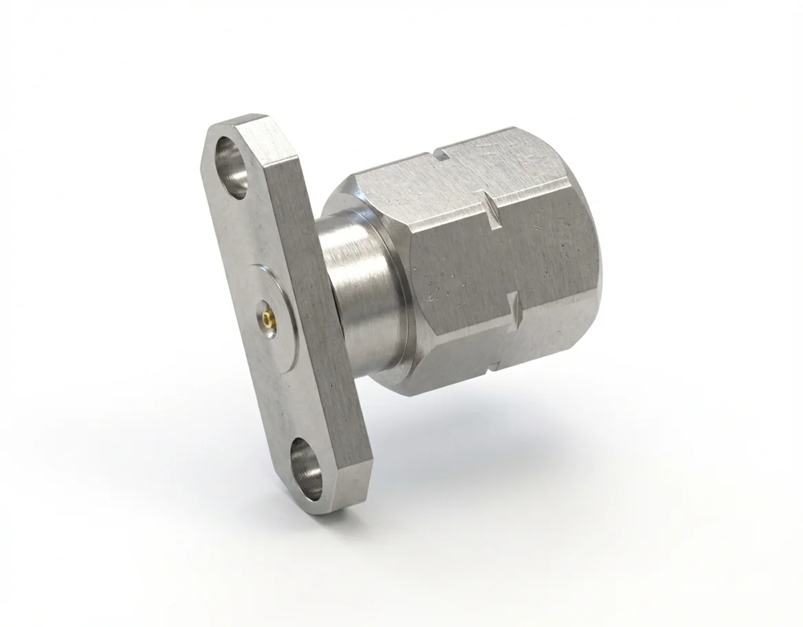 The 2.4 mm male 2-hole flange mount RF connector achieves VSWR ≤ 1.2 and insertion loss ≤ 0.06 √F(GHz) dB. The 0.30 mm pin ensures a consistent contact surface for reliable signal transfer across wide frequency bands.
