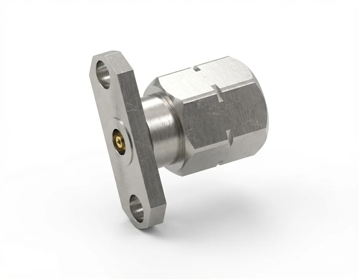 Offering VSWR ≤ 1.2 and insertion loss ≤ 0.06 √F(GHz) dB, the 2.4 mm male 2-hole flange mount RF connector ensures broadband stability and minimal reflection. The 0.46 mm pin reinforces contact strength for reliable performance under load.