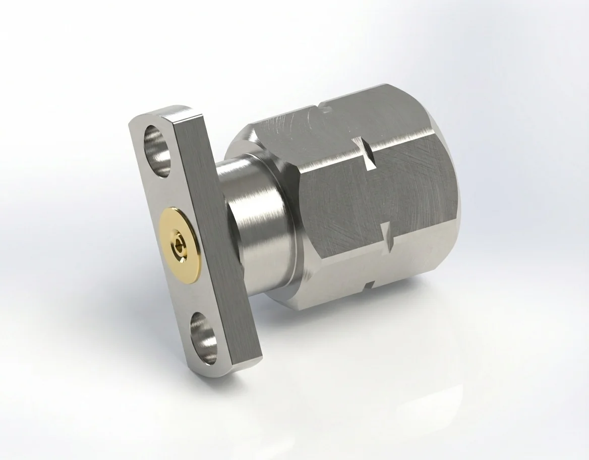 Used in broadband amplifier modules, precision calibration networks, and compact signal distribution assemblies, this connector integrates seamlessly with 2-hole flange mount RF connectors.