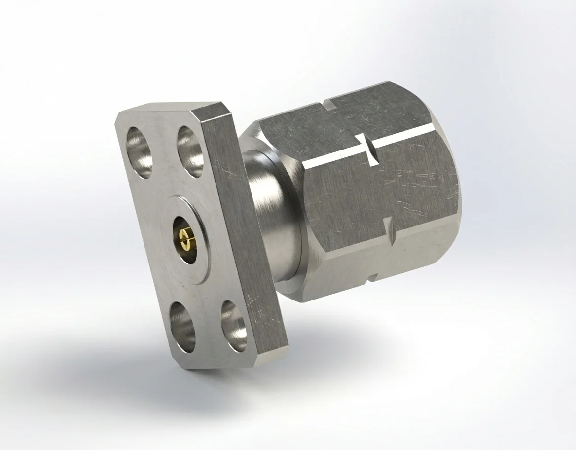 The 2.4 mm male 4-hole flange mount RF connector featuring a 0.46 mm pin and 5.64 mm hole spacing delivers high-power handling with outstanding signal fidelity. Rated for 50 Ω systems up to 50 GHz, this field-replaceable connector is built for laboratories and precision RF test benches.