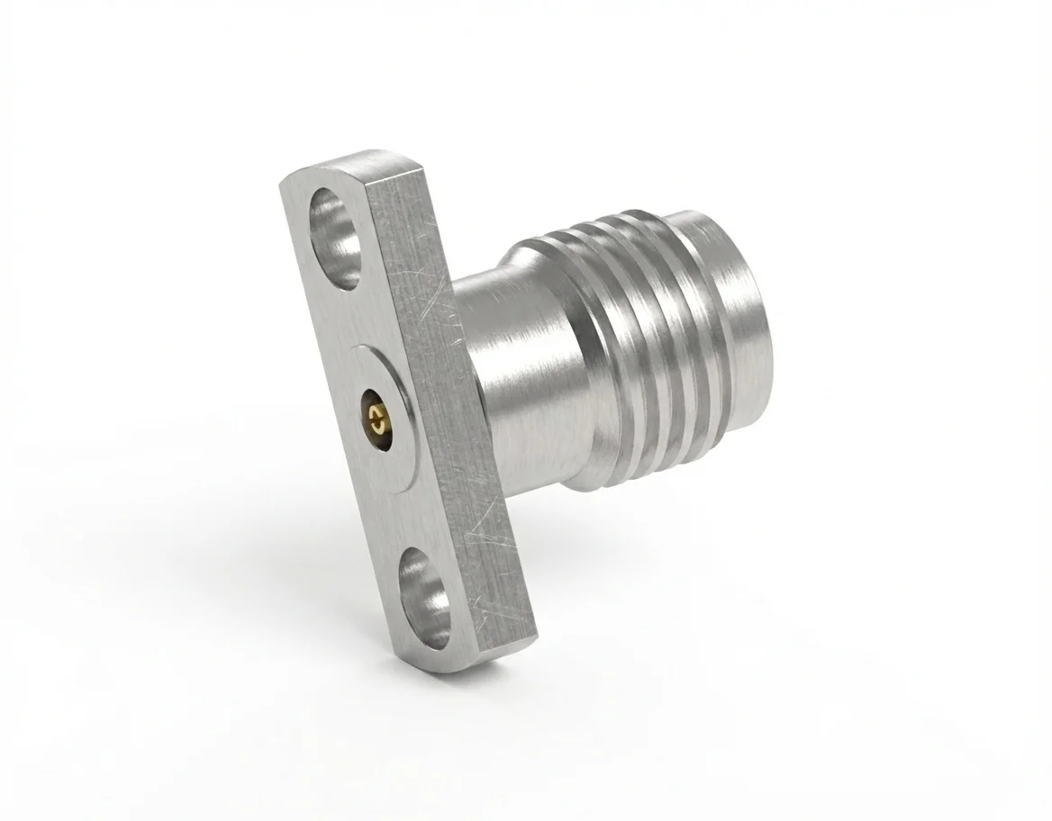 The 3.5 mm female 2-hole flange mount RF connector with a 0.30 mm pin and 12.7 mm hole spacing delivers precision alignment and stable performance to 26.5 GHz. Its field-replaceable configuration enables quick connector changes while preserving RF repeatability.