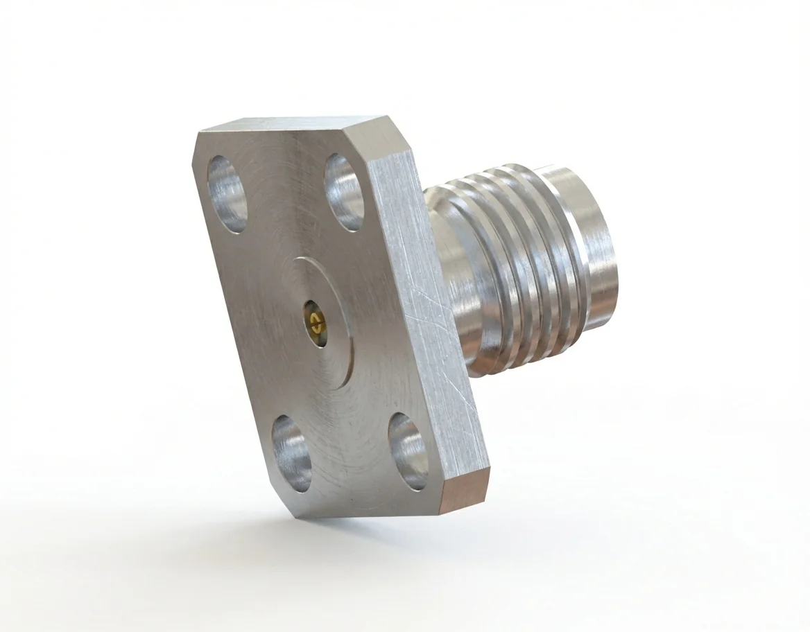 The 3.5 mm female 4-hole flange mount RF connector with a 0.38 mm pin and 8.64 mm hole spacing delivers broadband accuracy up to 26.5 GHz. Designed as a field-replaceable connector, it ensures secure mating and consistent electrical performance across repeated installations.