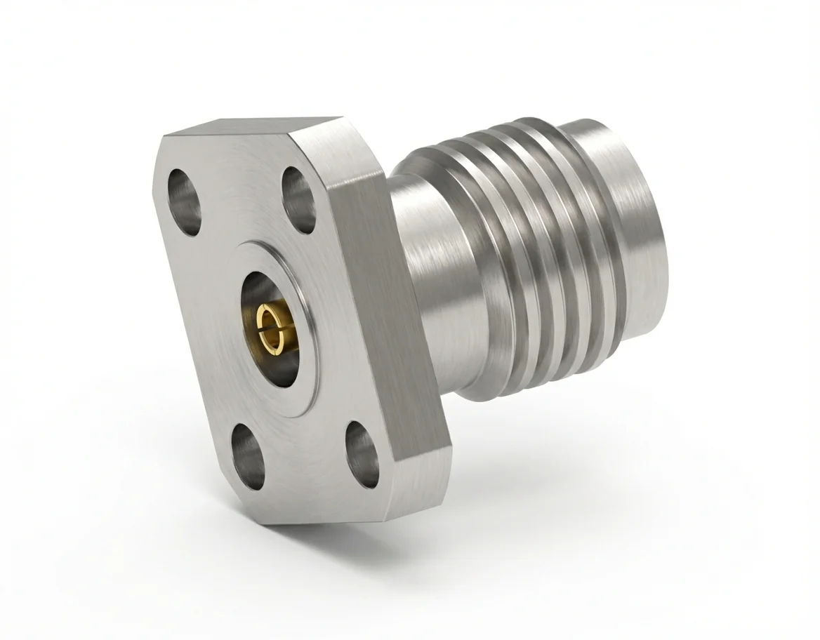 The 3.5 mm female 4-hole flange mount RF connector with a 0.90 mm pin and 6.35 mm hole spacing combines mechanical strength with excellent broadband precision up to 26.5 GHz. This field-replaceable connector ensures dependable connectivity in demanding RF environments.