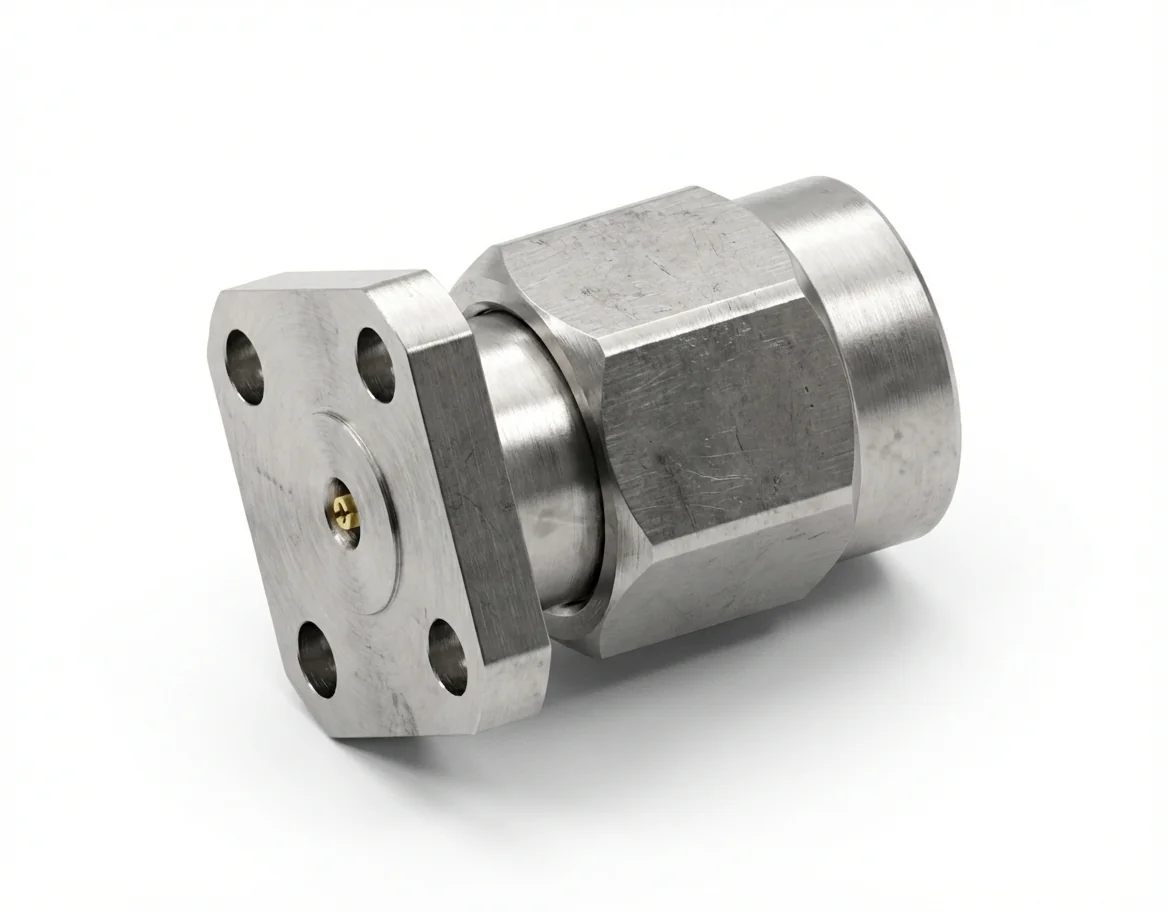 The 3.5 mm male 4-hole flange mount RF connector with a 0.23 mm pin and 6.35 mm hole spacing is designed for laboratory and production environments where stability and repeatability are critical. The field-replaceable mechanism enables efficient component swapping without degrading signal integrity up to 26.5 GHz.