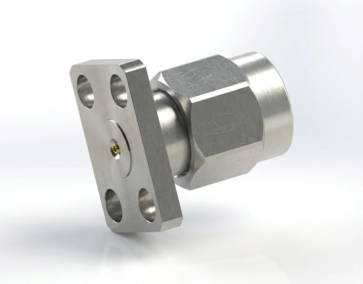 The 3.5 mm male 4-hole flange mount RF connector with a 0.38 mm pin and 5.64 mm hole spacing is designed for precision instrumentation, analyzers, and broadband calibration systems. The field-replaceable interface allows easy maintenance while maintaining mechanical integrity and stable phase performance.