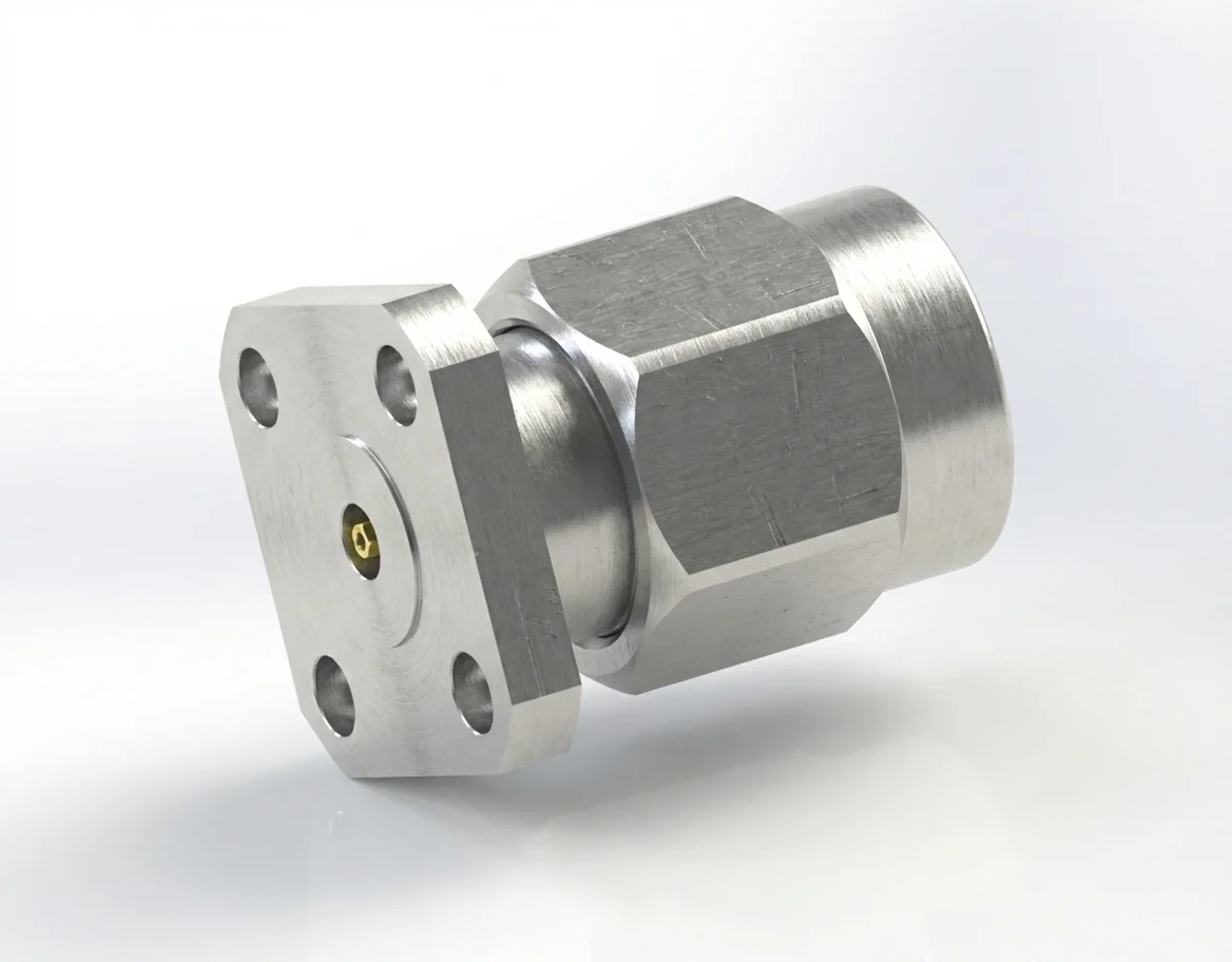 The 3.5 mm male 4-hole flange mount RF connector with a 0.38 mm pin and 6.35 mm hole spacing is precision-engineered for test systems requiring repeatable electrical interfaces. The field-replaceable construction simplifies maintenance while preserving mechanical integrity and phase stability.