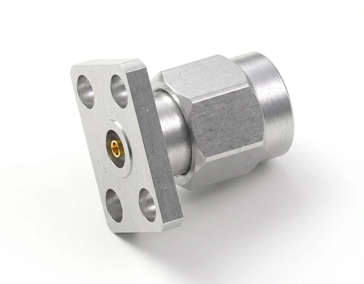 The 4-hole flange mount footprint (5.64 mm spacing) supports secure attachment to compact test fixtures and RF enclosures, maintaining mechanical integrity under vibration. Browse the RF connector catalog for complementary precision interfaces.