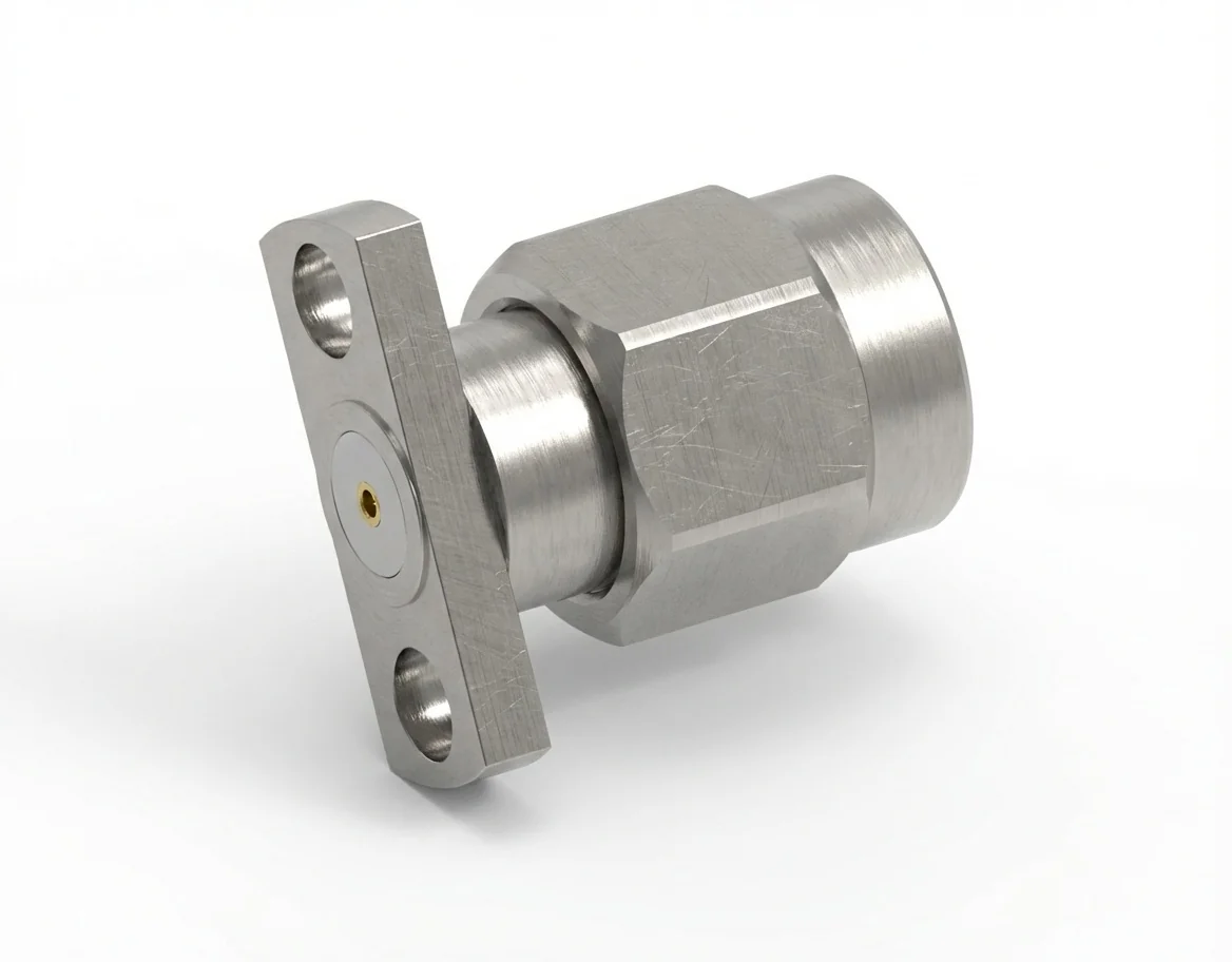 The SMA male 2-hole flange mount RF connector with a 0.46 mm pin and 9 mm hole spacing is optimized for compact RF calibration setups and portable analyzer systems. Its field-replaceable configuration enables fast reinstallation without signal degradation.
