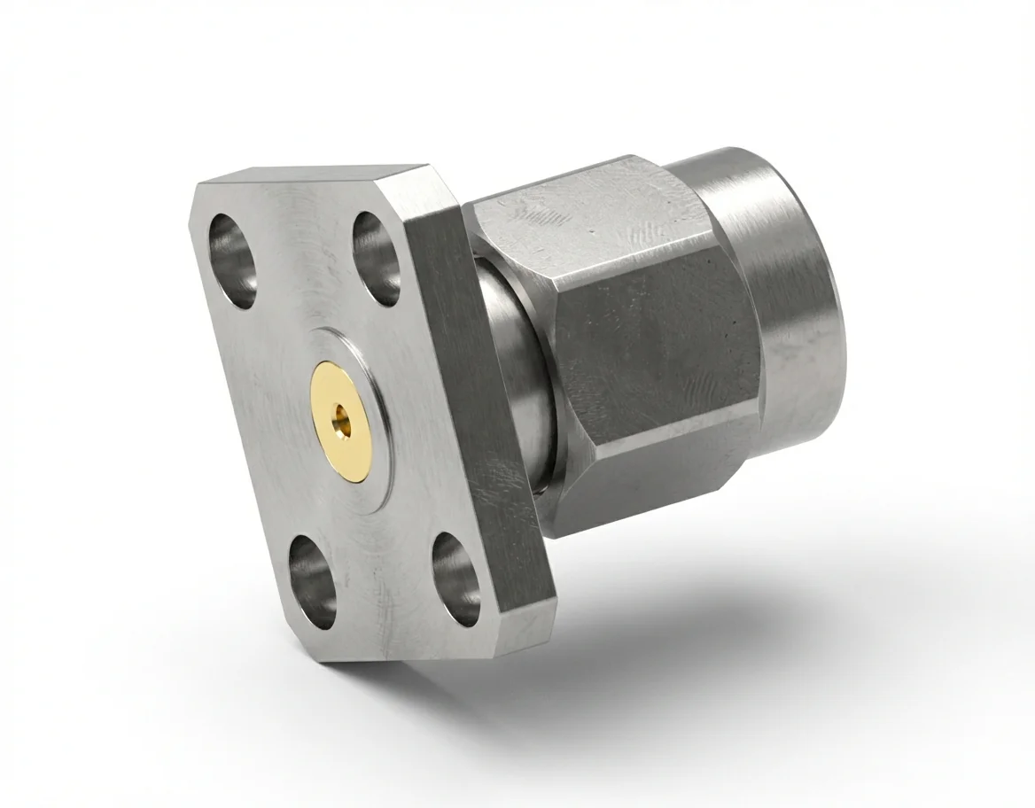 The SMA male 4-hole flange mount RF connector with a 0.51 mm pin and 8.64 mm hole spacing ensures broadband reliability for calibration instruments, analyzers, and high-frequency modules. Its field-replaceable assembly facilitates easy reconfiguration and consistent impedance control.